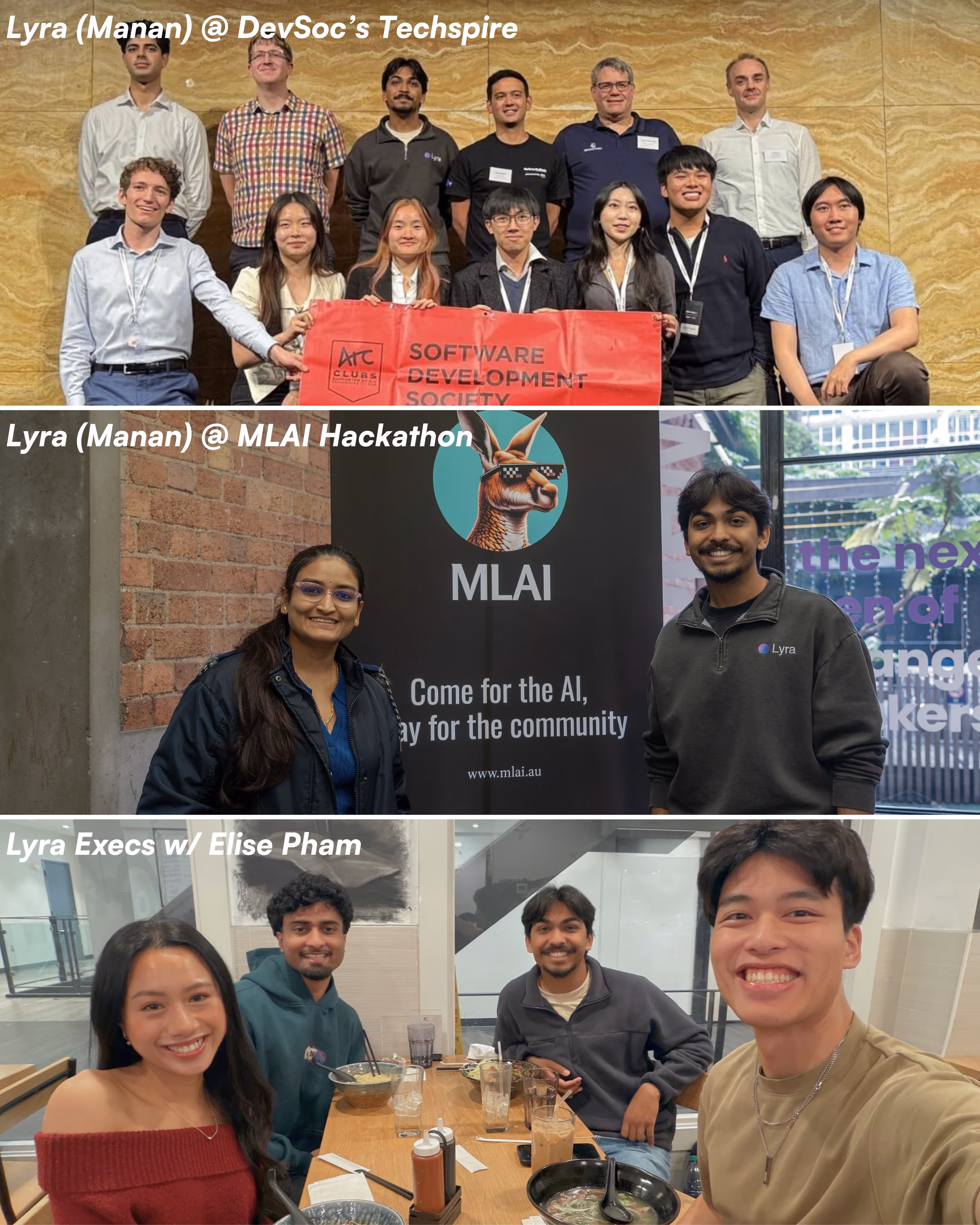 Manan flew to Melbourne for the weekend to attend the MLAI AUS Hackathon as a panelist, diving into the city’s fast-growing tech scene. The event brought together a dynamic mix of engineers, designers, sponsers and entrepreneurs all building with remarkable energy and ambition.It was genuinely eye-opening to see the quality of ideas, the level of collaboration, and the strong sense of community coming out of Melbourne. The experience reinforced our excitement to continue engaging with this vibrant ecosystem and expanding Lyra’s presence, while supporting and learning from talented individuals pushing the boundaries of what’s possible.