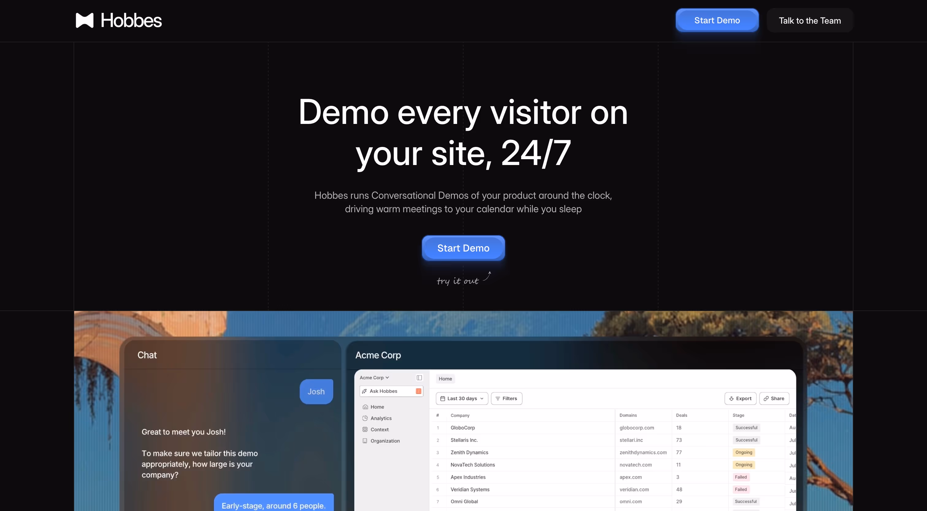 Hobbes runs AI-powered conversational product demos 24/7, turning website visitors into warm, qualified meetings on your calendar.