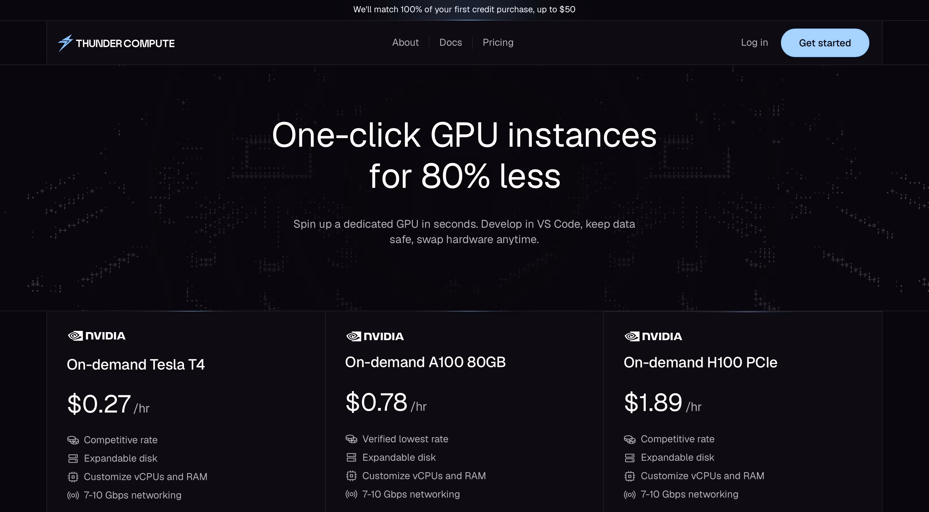 One-click dedicated GPU instances (T4/A100/H100) in seconds—build in VS Code, keep data safe, and swap hardware anytime for up to 80% less than AWS.